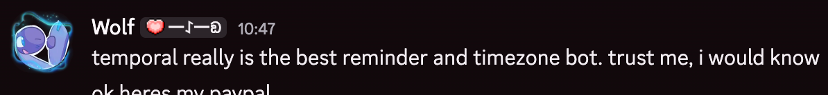 Temporal lets you easily set reminders with human time strings like "2 hours", "4h", or "tomorrow at 8pm". You can make it send the reminder to your DMs, or you can send it in the current channel.